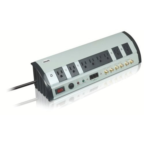 The Philips Home Theater Surge Protector is for the home theater enthusiast. This advanced surge protector filters EMI/RFI noise ensuring only the cleanest power enters your electronic equipment. It comes with 3 gold-plated coax connectors that reduce noise in picture, keep data safer with cable modems, and protect coaxial signals from surges and spikes. It also features a phone line splitter with line protection. An 8-foot cable with a flat, right-angle plug directs the cord away from lower outlets and allows furniture to sit more closely to the wall.