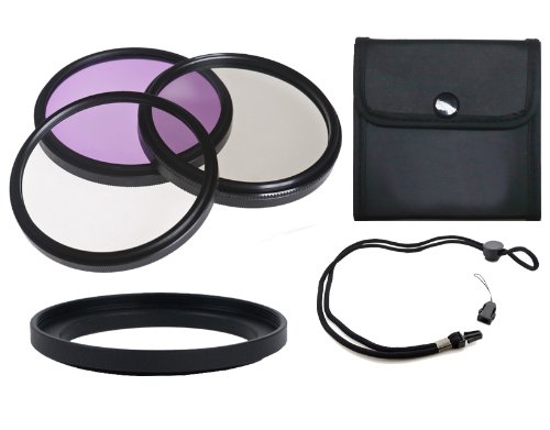 This Item Includes: 1. UV Lens Filter 2. Circular Polarizing Filter 3. Flourescent Filter 4. Filter Pouch 5. Krusell Neck Strap 6. Filter Adapter. Lens filters are translucent pieces of glass placed in front of a camera lens to alter or adjust the light entering the camera and more importantly to protect the camera lens. Lens filters improve photographs by giving photographers control over light and allowing them to emphasize the features of a scene that they consider most important. This filter kit is a combination of the three essential filters no photographer should be without.UV--Film and a digital CCD are more sensitive to UV light than our eyes are. This often shows up in images shot from high altitudes and long distances especially over water. This filter will remove the UV light and more importantly protect your lens from moisture, scratches, and damage. Circular Polarizer--provides color and contrast enhancement. Reflected light often shows up as a whitish glare that washes out color in an image. A polarizing filter will correct this problem creating deep blue skies. It also removes glare from non-metallic surfaces such as windows and water. FLD--provides color correction when shooting under fluorescent lighting. It will remove the greenish tint from the image, providing pleasing skin tones and true to life color renditions. Warranty:10 year manufacturer warranty. Made in Japan